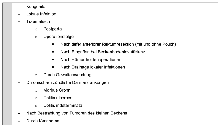 Insbesondere in den älteren Arbeiten stellen postpartale Fisteln mit 88% den größten Anteil dar [7]. Sie sind Folge des Dehnungstraumas sub partum mit Zerreißung des Dammes und des rektovaginalen Septums [10].
