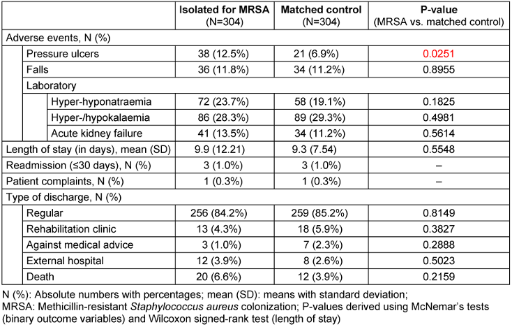Patients isolated for MRSA colonization acquired about 45% more pressure ulcers than did non-isolated matched controls (12.5% vs. 6.9%; p=0.0251) during their hospitalization (Table 3 [Tab. 3]). Numbers of falls, hyper-/hyponatremias, hyper-/hypokalaemias, acute kidney failures, patient complaints, and 30-day readmission rates did not differ significantly between groups. Furthermore, length of stay did not differ significantly between groups. Regarding type of discharge, patients isolated for MRSA colonization tended to be less likely to be discharged to a rehabilitation clinic (4.3% vs. 5.9%; p=0.3827) and showed a trend towards higher mortality rates (6.6% vs. 3.9%; p=0.2159) compared to non-isolated matched controls (Table 3 [Tab. 3]).
