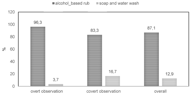 Comparing the type of hand washing between the two observation methods, the overtly observed use of ABHR was 96%, compared to 83% in covert observation. In general, the use of ABHR was much higher than soap and water (87.1% vs. 12.9%; Figure 1 [Fig. 1]).