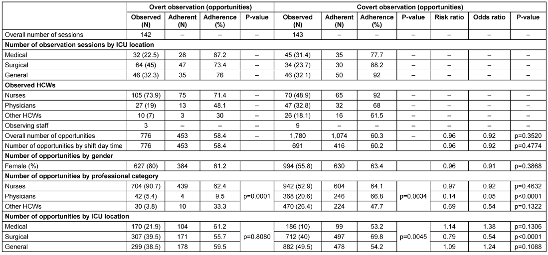 A total of 2,556 opportunities were observed: 776 opportunities during 142 observation sessions using overt observation and a total of 1,780 opportunities during 143 sessions using covert observation (Table 1[Tab. 1] ). For the two observation methods, the majority of those observed were nurses (73.9% and 48.9%, respectively). The highest hand antisepsis adherence in overt observation was related to the surgical ICU, and the highest in covert observation was related to the general ICU (45% and 32.1%, respectively). In overt observation, all observations were during the day and yielded 58.4%; covert observation yielded 60.2% during the day and 60.4% during the night. In total, 80% of hand antisepsis, overtly observed, was performed by females, and in covert observation, this rate was 55.8%. In overt observation, out of 776 opportunities, 58.4% performed hand antisepsis. In covert observations, of 1074 opportunities, the rate of hand antisepsis carried out was 60.3%.