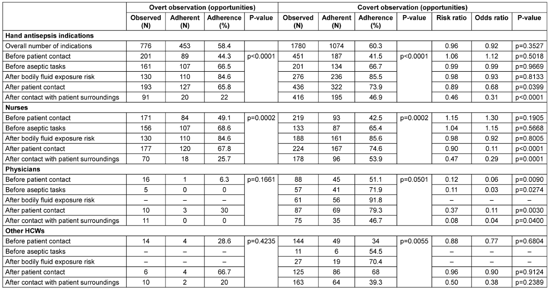 Table 2: Hand antisepsis adherence by observation method, professional category, and hand hygiene indication