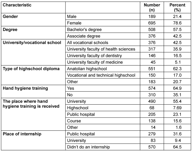 A total of 884 participants (695 female, 189 male) with a mean age of 20.2±2.61 (17–49) years completed the survey by answering all questions. 42.5% of the participants were studying at vocational schools of health services, 35.9% at a University health-sciences department, 16.5% at a University faculty of dentistry, and 5.1% at a University faculty of medicine. 64.9% of the participants stated that they had received HH training, while 35.1% stated that they had not (Table 1 [Tab. 1]).