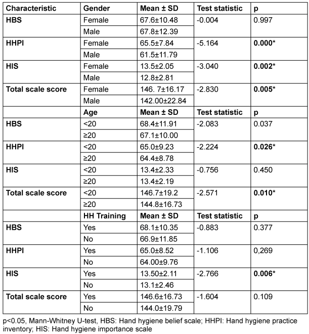 Table 4: Influence of gender, age, and HH training on hand hygiene belief scale, hand hygiene practice inventory, hand hygiene importance scale and total scale scores
