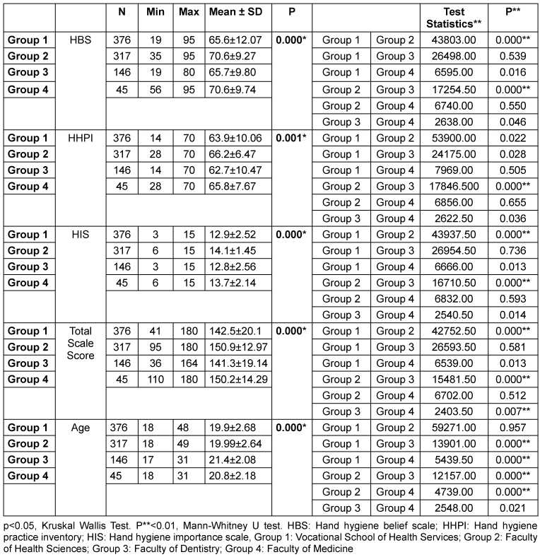 Table 5: Influence of university department on hand hygiene belief scale, hand hygiene practice inventory, hand hygiene importance scale and total scale scores