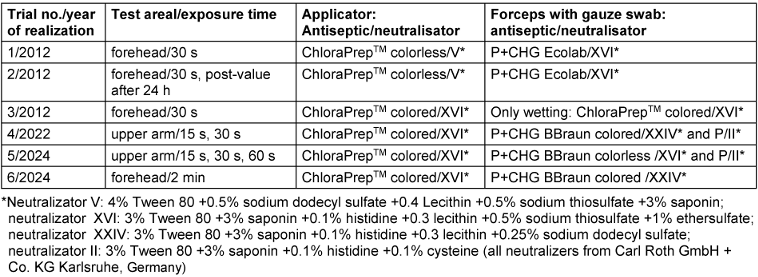 In 6 trials (Table 1 [Tab. 1]), the efficacy of formulations based on 70% v/v propan-2-ol (P) +2% w/v chlorhexidine digluconate (CHG) from different manufacturers was compared when applied with single-use applicator, forceps and gauze swab, or only by gently wetting the skin. In 2 trials, P was included in the comparison. Depending on the antiseptic, different neutralizers were used. The effectiveness of the neutralization was tested according to method 9 of the VAH [5].