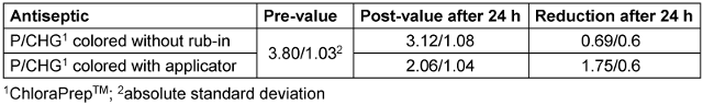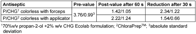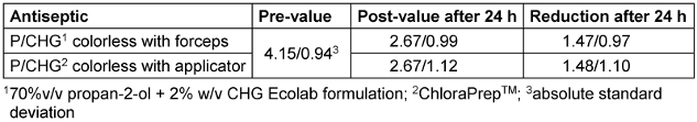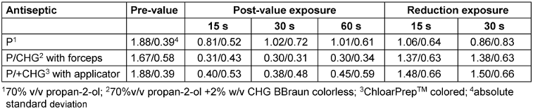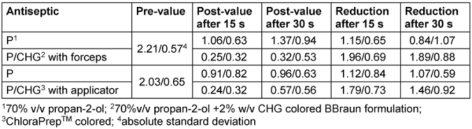 The efficacy of the formulations based on P/CHG did not significantly differ after application with the applicator or with the forceps on the upper arm (Table 6 [Tab. 6]).