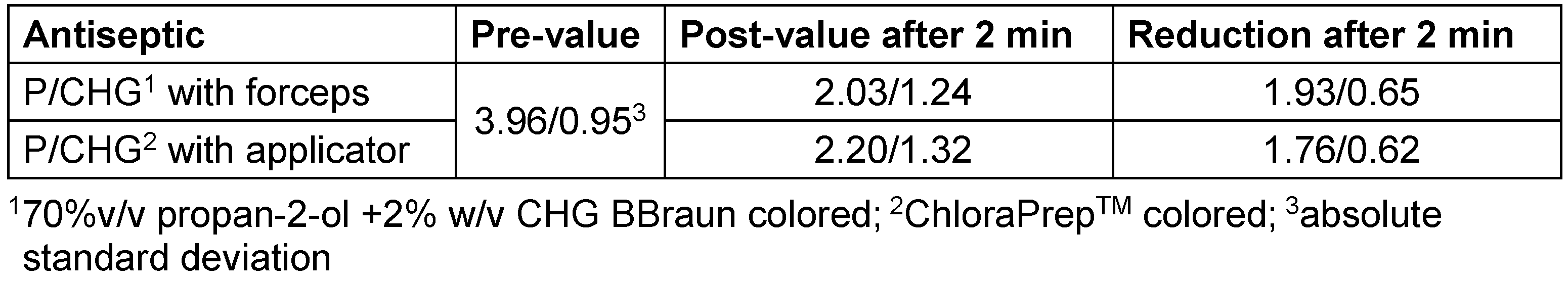 Methode: Der Vergleich wurde am Oberarm (talgdrüsenarme Haut) und auf der Stirn (talgdrüsenreiche Haut) von Probanden gemäß der Prüfmethode 13 des Verbunds für Angewandte Hygiene zur Zertifizierung von Hautantiseptika in Deutschland durchgeführt. Das Antiseptikum, 70% v/v Propan-2-ol (P) +2% w/v Chlorhexidindigluconat (CHG), wurde mittels Applikator, mittels Kornzange und Tupfer oder durch Benetzung ohne mechanisches Einreiben auf die Testfläche aufgetragen. Nach unterschiedlichen Expositionszeiten wurden mit sterilen Tupfern Proben vom Applikationsareal entnommen, in Trypsin-Soja-Bouillon überführt und auf Trypsin-Soja-Agar ausplattiert. Die Reduktion der Hautflora wurde anhand der Anzahl Kolonie bildender Einheiten vor und nach der Antisepsis berechnet.