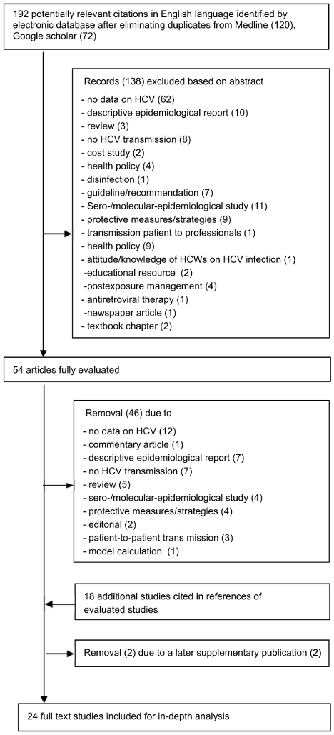 Review articles, guidelines, conference abstracts, newspaper articles, press releases, commentaries, editorials, studies without a defined HCV source and articles with a central theme diverging from or not related to reported professional-to-patient transmission of HCV were excluded. No restrictions were applied regarding study design, patient subpopulation, or mode of data collection (prospective or retrospective). If studies reported preliminary findings, the most complete and up-to-date and complete data version of the data was used.