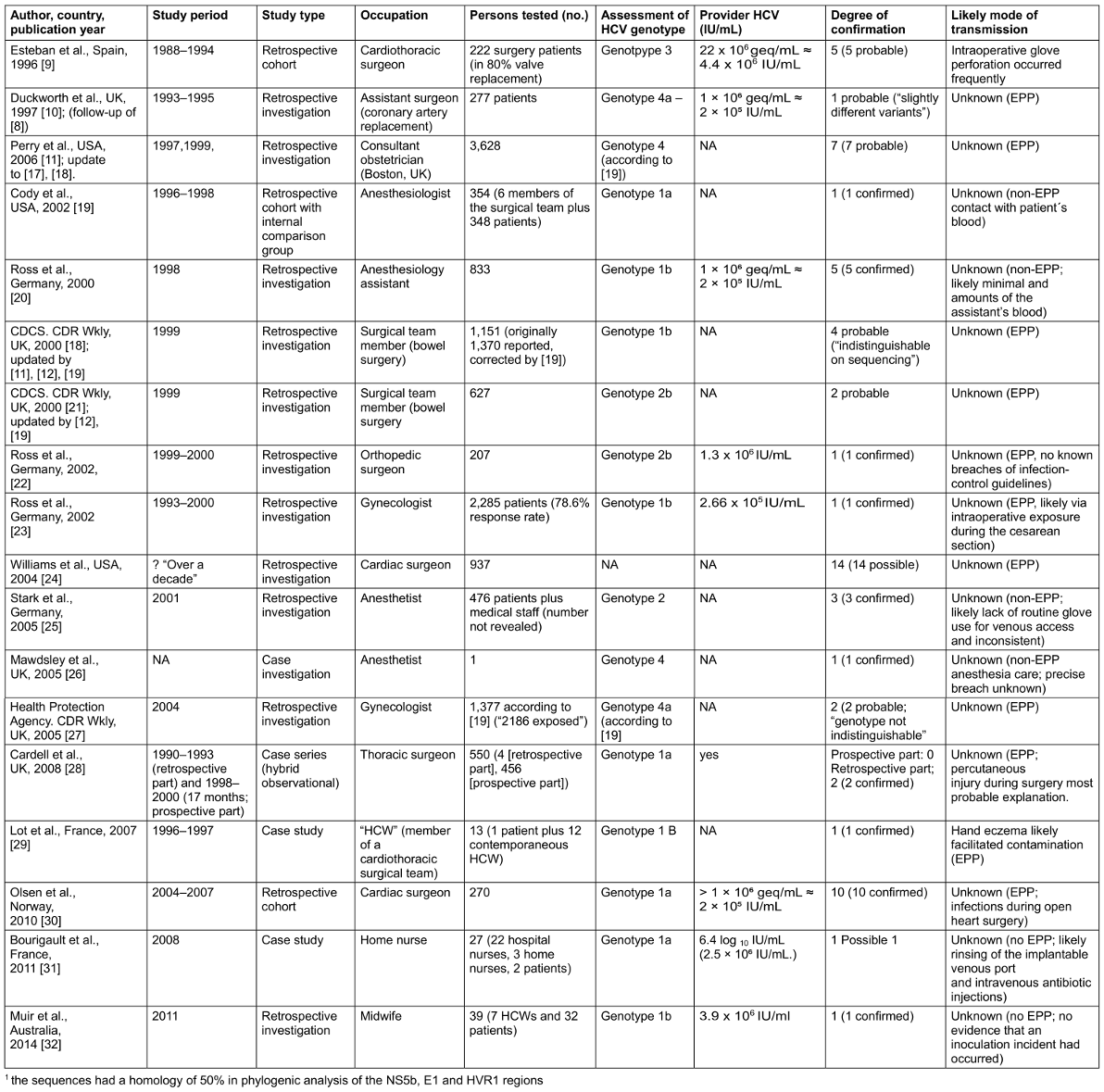 In 12 studies, transmissions were attributed to surgeons of various specialties performing EPPs. In four studies, the source was an anaesthesiologist; in one study, a home-care nurse; and in another, a midwife. Only two studies documented specific hand injuries in the transmitting HCW, whereas in 16 of 18 studies involving direct transmission, no obvious mechanism was identified. It is noteworthy that the exposure period of the reported possible direct transmissions related to EPP ended in September 2008 [31].