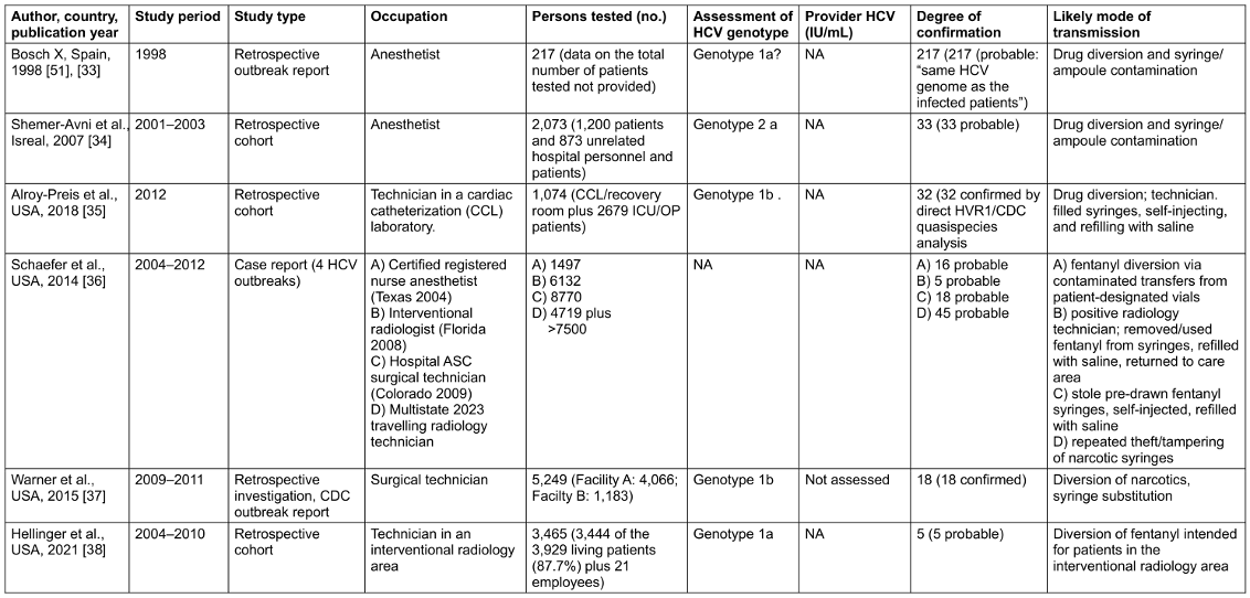 [35] Alroy-Preis S, Daly ER, Adamski C, Dionne-Odom J, Talbot EA, Gao F, Cavallo SJ, Hansen K, Mahoney JC, Metcalf E, Loring C, Bean C, Drobeniuc J, Xia GL, Kamili S, Montero JT; New Hampshire and Centers for Disease Control and Prevention Investigation Teams. Large Outbreak of Hepatitis C Virus Associated With Drug Diversion by a Healthcare Technician. Clin Infect Dis. 2018 Aug 31;67(6):845-53. DOI: 10.1093/cid/ciy193