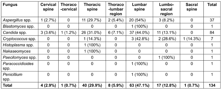 The fungal detection in various spine regions is summarised in Table 2 [Tab. 2]. Only Aspergillus, Candida and Cryptococcus spp. were detected in different regions.