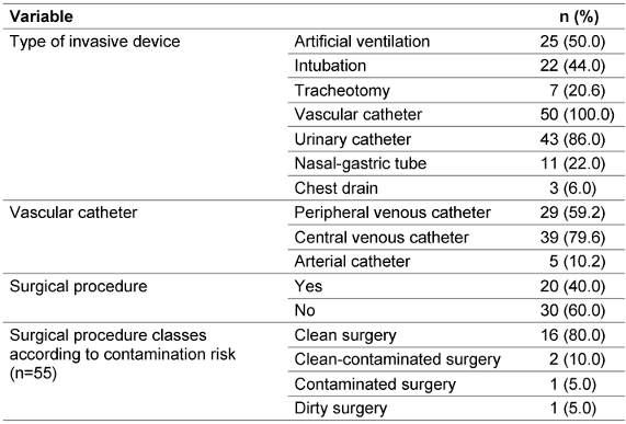 On the day of the survey, all patients in ICUs had at least one invasive device, which are the main cause of HAIs, particularly when handling and hygiene rules are not strictly followed [25], [26]. In addition, HAIs associated with invasive devices affect between 24.3% and 27.6% of patients in ICUs, demonstrating their significant impact on the risk of infection in intensive care [27].