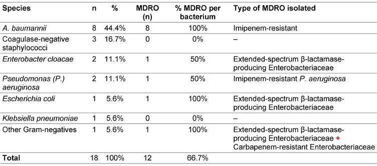 Ergebnisse: Von 50 eingeschlossenen Patienten wiesen 30,0% eine nosokomiale Infektion auf. Die häufigste Lokalisation war die Lunge. Von 18 Bakterienspecies, die bei 15 Patienten isoliert wurden, waren 66,7% multiresistent. Die am häufigsten isolierte Spezies war Acinetobacter baumannii (44,4%) mit einer Resistenzrate von 100% gegen Imepenem.