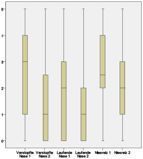 Die Beantwortung der Fragebögen erlaubt zugleich eine Analyse der Veränderung typischer allergischer Symptome; die Prüfung auf Signifikanz erfolgte mit dem Wilcoxon-Test. Im Mittel nahmen zum Ende der Studie die Intensitäten der über den Wochenverlauf häufig bzw. stark auftretenden Beschwerden wie verstopfte Nase (p=0,001), laufende Nase (p=0.014) und Niesreiz (p=0,145) ab (Abbildung 5 [Abb. 5]). Eine Abnahme war auch für die in der Wochenhäufigkeit weniger ausgeprägten Beschwerden gerötete Augen, Tränende Augen, geschwollene Augen, Jucken und Husten erkennbar (Abbildung 6 [Abb. 6]). Bis auf den Parameter verstopfte Nase wurde der Unterschied wischen den Vor- und Nachwerten jedoch nicht als signifiant bewertet. Die Parameter Brennen, Hautrötungen, Atemnot, und asthmatischer Anfall" traten zu selten auf, als dass ein Einfluss abgeleitet werden könnte.