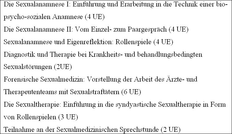 Ab dem 5. Semester wird Sexualmedizin als Wahlpflichtfach (42 UE) mit einem Vorlesungskomplex und einem Praktikum angeboten. Die Teilnahme am ersten Abschnitt des Curriculums ist keine notwendige Voraussetzung. Die Vorlesungen sind für einen breiten Hörerkreis geöffnet. In 18 UE wird ein umfangreiches Themenspektrum vermittelt. Die Lehre umfasst evolutionsbiologische Aspekte, Grundlagen der psychosexuellen Entwicklung bis hin zur Krankheitslehre verschiedener Sexualstörungen sowie deren Diagnostik, Differentialdiagnostik und Therapie. Weil Sexualmedizin an der Universität Greifswald nicht in Form einer eigenständigen Institution besteht, erfolgt zur Realisierung eines umfassenden Lehrangebotes die Kooperation mit dem Arbeitskreis Sexualmedizin Mecklenburg-Vorpommern und der Akademie für Sexualmedizin. Die Darstellung der Themenkomplexe aus der Sicht verschiedener Professionen in der Medizin gibt dem Studierenden einen Einblick in die Komplexität von Sexualität und demonstriert die Notwendigkeit einer bio-psycho-sozialen Betrachtungsweise (siehe Abbildung 2 [Abb. 2]).