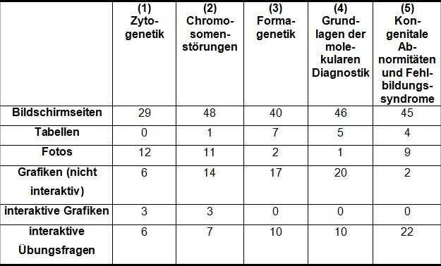 Aktuell werden fünf - teilweise interaktive E-Learning-Module (siehe Abbildung 1 [Abb. 1]) zur Lehre im Fach Humangenetik eingesetzt: Zytogenetik, Chromosomenstörungen, Formalgenetik, Grundlagen der Molekulardiagnostik sowie Kongenitale Abnormitäten und Fehlbildungssyndrome (siehe Tabelle 1 [Tab. 1]).