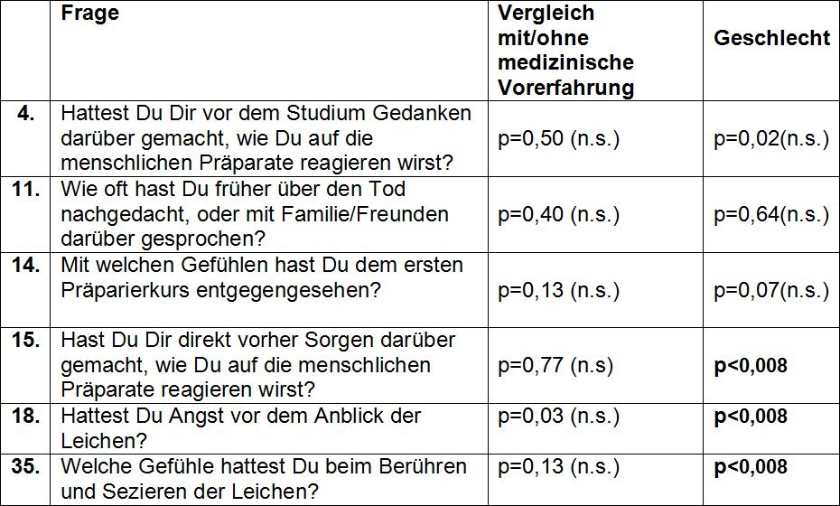 Die Literatur über medizinische Studienanfänger und die makroskopische Anatomie ist relativ umfangreich. In der Diskussion wird auch Bezug zu internationalen Arbeiten genommen. In ihrer Dissertation „Aspekte der Sozialisation zum Arzt: Eine empirische Studie über Auswirkungen der praktischen Makroanatomie auf Medizinstudierende und deren Einstellung zu Sterben und Tod“ hat Egbert [5] anhand von den Veränderungen und Einstellungen zu Sterben, Tod und Todesfurcht den prägenden Einfluss des Präparierkurses untersucht. Für ihre erste Hypothese: „Die Teilnehmer haben zu Beginn des Präpkurses eine andere Einstellung zu Tod und Sterben als am Ende des Kurses“ verwendete sie die Todesfurcht als Messgröße. Es konnte kein signifikanter Unterschied zwischen den beiden Messpunkten bestätigt werden. Jedoch zeigte die Untersuchung ihrer zweiten Hypothese: „Die Einstellungen zu Tod und Sterben verändern sich bei den Teilnehmern, die berufliche Erfahrungen mit dem Thema Sterben und Tod gemacht haben weniger stark, als bei den Teilnehmern des Präpkurses ohne solche Erfahrungen“ eine Bestätigung dieser Aussage. Im Hinblick darauf ist es interessant zu erfahren, inwieweit Unterschiede bezüglich der Angst und der emotionalen Belastung zwischen weiteren Gruppen bestehen, wie z.B. Gruppen unterschiedlichen Alters, unterschiedlichen Geschlechts und unterschiedlicher emotionaler Prägungen.