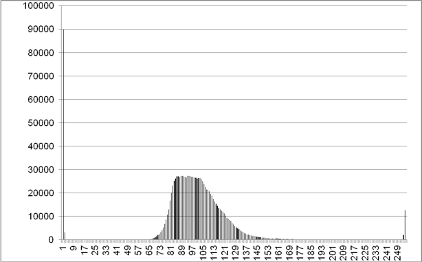 Abbildung 5: Histogramm der Farbverteilung im standardisiert aufgenommenen und bearbeiteten Foto (X-Achse = Farbwerte von 0-255, Y-Achse = Anzahl Pixel pro Farbwert)