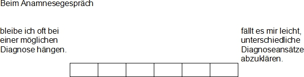 Der DTI-Fragebogen misst die Selbsteinschätzung der wissensunabhängigen Komponente des klinischen Denkens und besteht aus insgesamt 41 Fragen (Beispielfragen siehe Tabelle 1 [Tab. 1]). Dabei lassen sich 20 Fragen der Subskala „Flexibilität des Denkens“ und 21 Fragen der Subskala „Strukturierung des klinischen Denkens“ zuordnen (Beispiele s. unten). Die Flexibilität des Denkens bildet die Fähigkeit des Teilnehmers ab, während des Diagnoseprozesses auf die richtige Diagnose zu kommen und flexibel neue Informationen zu verarbeiten. Die Struktur des Denkens spiegelt wider, wie gut das klinische Wissen, auf das während des Diagnoseprozesses zurückgegriffen wird, organisiert und verfügbar ist. Jede Frage besteht aus einem Fragenstamm (meist einer Feststellung) und einer Antwortskala. Die Antwortskala bietet zwei entgegengesetzte Antworten/Aussagen zu der Eingangsfeststellung mit sechs Auswahlfeldern zum Ankreuzen dazwischen. Die Teilnehmer sollen das Feld ankreuzen, das am besten ihre Einstellung auf der Skala zwischen den Antwortmöglichkeiten widerspiegelt. Die Fragen sind willkürlich „linksbündig“ bzw. „rechtsbündig“, d.h. die Antwort, die ein weiter fortgeschrittenes klinisches Denken wiedergibt, ist unterschiedlich mal links oder rechts aufgeführt.