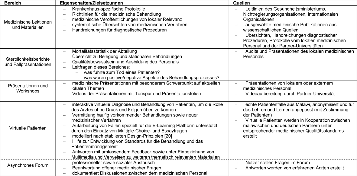 Inhalte und die Gestaltung der E-Learning Plattform richteten sich in erster Linie nach den Bedürfnissen der Interns, insbesondere wurden lokale Relevanz und landesspezifische Pathologie berücksichtigt [2], [7], [8]. Der Ausbildungsbedarf wurde von den verantwortlichen Ärzten in Malawi entsprechend relevanter Richtlinien festgelegt und in Absprache mit den deutschen Projektpartnern in einem Anforderungsbegleitheft der medizinischen Abteilung für die Interns spezifiziert. Der Inhalt ist darauf ausgerichtet, die Interns während ihrer Internship in der medizinischen Abteilung zu unterstützen, vor allem hinsichtlich der geforderten Ausbildungsziele der Abteilung. Dabei liegt der Fokus auf praktischen Kenntnissen, wie beispielsweise Patientenmanagement und Demonstration von medizinischen Prozeduren, z.B. Lumbalpunktion.