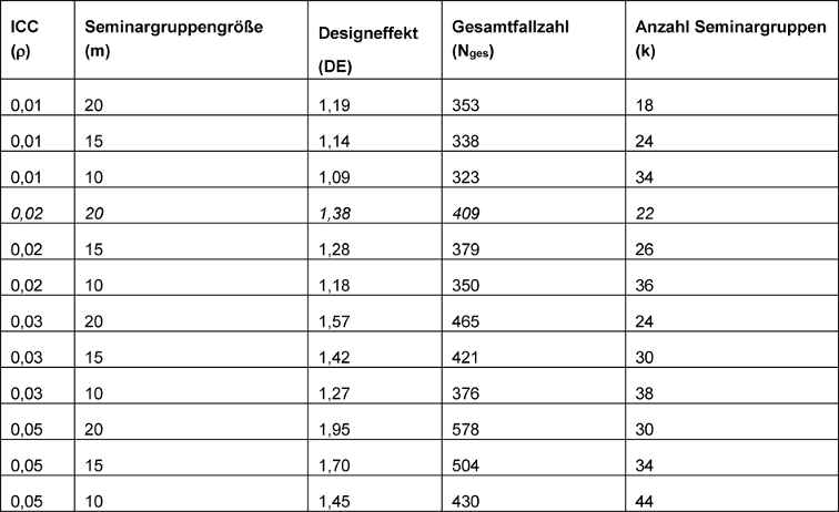 Tabelle 4: Auswirkungen der Größenordnung des ICC und Größe der Seminargruppen auf Gesamtfallzahl und Anzahl der Seminargruppen in der Gesamtstudie (kursiv=Studiensituation)