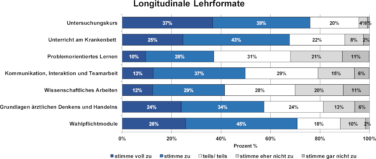 Abbildung 3: Ergebnisse der studentischen Evaluation zur Zufriedenheit mit den longitudinalen Lehrformaten im Modellstudiengang Medizin. Dargestellt sind die relativen Anteile der Studierenden, die die Aussagen auf einer 5-stufigen Likert-Skala von „stimme voll zu“ bis „stimme gar nicht zu“ bewertet haben.