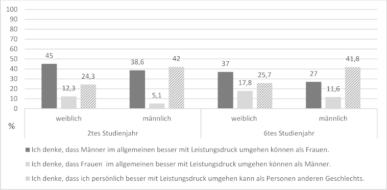 Ergebnisse: Zu Beginn des Studiums fühlten sich weibliche Studierende signifikant seltener den Anforderungen des Studiums gewachsen (87,5% vs. 94,4%), Leistungsdruck stellte das größte Problem für Studentinnen (50,9%) wie Studenten (45,8%) dar. Am Ende des Studiums klagten signifikant mehr weibliche als männliche Studierende über Konkurrenz zwischen den Kommilitoninnen bzw. Kommilitonen (33,3% vs. 8%). Die Hälfte der Studierenden war der Ansicht, dass zwischen beiden Geschlechtern keine Unterschiede im Umgang mit Leistungsdruck bestünden, in der anderen Hälfte allerdings überwog eindeutig die Meinung, dass Männer diesbezüglich Frauen überlegen seien. Zu Beginn und am Ende des Studiums waren signifikant mehr Studenten als Studentinnen davon überzeugt, persönlich besser mit Leistungsdruck umgehen zu können als Studierende des anderen Geschlechts.