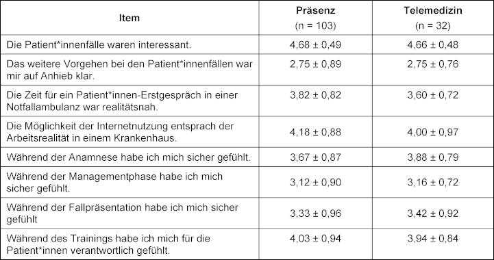 Schlussfolgerung: Das Telemedizinformat des kompetenzbasierten Trainings funktionierte genauso gut wie das Präsenzformat. Im Telemedizinformat kann das Training Studierenden unabhängig von deren Standort angeboten werden.