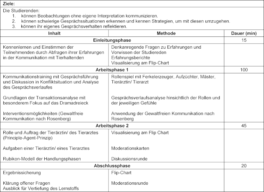 Während der Einleitungsphase werden die Studierenden mit Fragen bezüglich ihrer bisherigen Erfahrungen und ihres Vorwissens auf die folgende Lehreinheit eingestimmt. Im anschließenden Rollenspiel wird eine in der tierärztlichen Bestandsbetreuung von Schweinebetrieben häufig vorkommende Konfliktsituation simuliert. Die Kommunikation und Gefühle, die in dem Rollenspiel entstehen, dienen als Grundlage für die folgenden unterschiedlichen theoretischen Ansätze.