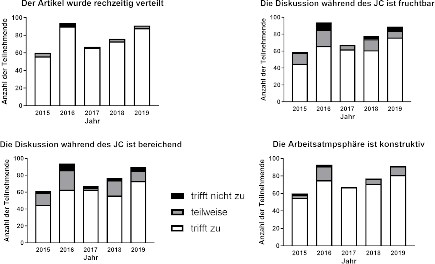 Für den Erfolg der JC-Sitzung ist der Zeitplan der Verteilung des Artikels wesentlich [17]. Wird der Artikel rechtzeitig an die Teilnehmenden weitergeleitet, haben sie genügend Zeit, den Artikel sorgfältig zu lesen, so gut wie möglich zu verstehen und Abschnitte zu bestimmen, die sie zum Erreichen ihrer Lernziele eingehender erörtern möchten. Die Evaluation zeigte, dass die Artikel in den meisten Fällen rechtzeitig verteilt wurden (siehe Abbildung 4 [Abb. 4]). Damit der Verlauf des JC erfolgreich ist, muss die Arbeitsatmosphäre konstruktiv sein [12]. Tatsächlich empfanden etwa 100% der Teilnehmenden des JC im Jahr 2017 die Arbeitsatmosphäre als konstruktiv. Demgegenüber antworteten im Jahr 2016 nur 80 % der teilnehmenden Personen mit „trifft eher zu“ oder „trifft zu“ (siehe Abbildung 4 [Abb. 4]).