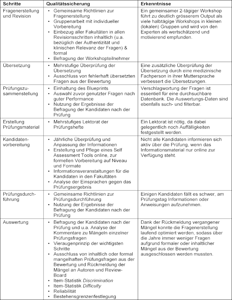 Ergebnisse: Die zentralen Schritte umfassen: Fragenerstellung, -revision, -übersetzung; Prüfungszusammenstellung und Materialherstellung; Kandidatenvorbereitung; Prüfungsdurchführung und -auswertung. Die Qualitätssicherungsmassnahmen bestehen aus Richtlinienkohärenz bei der Fragenerstellung und Prüfungsdurchführung, Revisionsprozessen, Prüfungszusammenstellung auf Basis des nationalen Blueprints, mehrstufiger Überprüfung der Übersetzungen und des Prüfungsmaterials sowie der statistischen Auswertung der Prüfung und der Kandidatenkommentare.