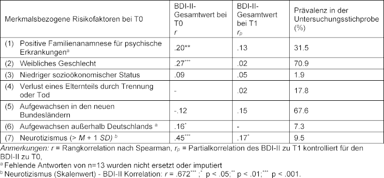 Tabelle 1: Pearson-Korrelationen zwischen merkmalsbezogenen Risikofaktoren bei T0 und BDI-II-Gesamtscore, Prävalenz der merkmalsbezogenen Risikofaktoren in der Untersuchungsstichprobe