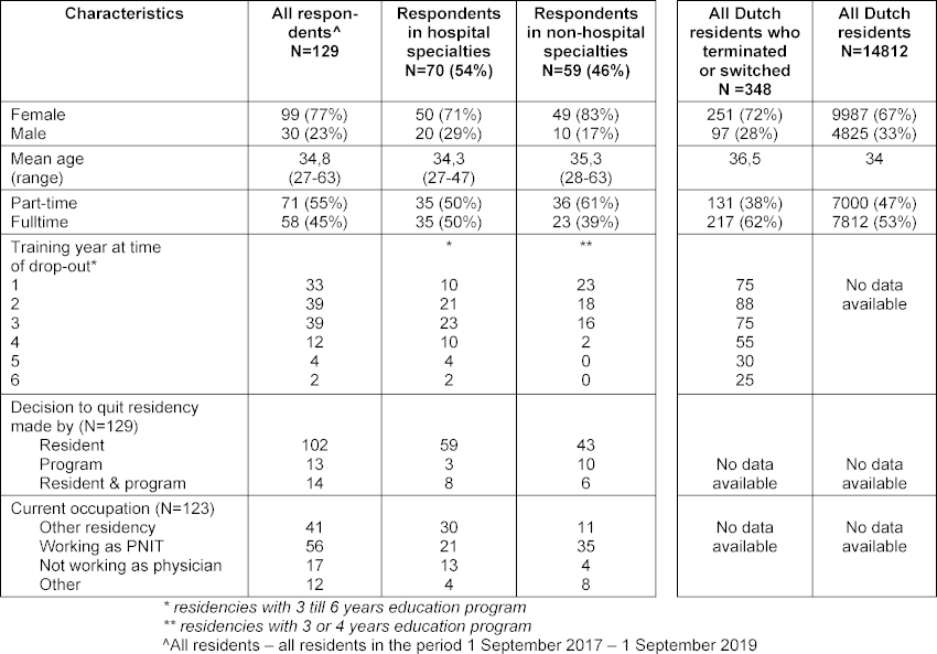 This study has limitations. This was a retrospective study with residents who quitted residency within two prior years. It is possible that those respondents who left residency long ago may have forgotten details; a selective memory could have affected their answers. The survey was sent to all residents who dropped out during this period. However, the survey was sent anonymously, and we could not send personal reminders. While our sample was a fair representation of the population, seven respondents exceeded the age of 45. We initially excluded them from our sample, but as this did not lead to essential differences in the results we included them. Our study findings could have been affected by a somewhat larger proportion of women in our sample: 76% in our study and 72% in the study population group vs 67% in the group of Dutch residents. There was also a larger proportion of part-time respondents: 55% in our sample and 38% in the reference group vs 47% in the group of all Dutch residents. With these points in mind, we should be careful with the interpretation of the differences between the subgroups.