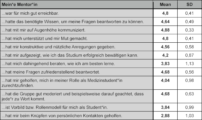 Die Peer-Mentees bewerteten ihre Peer-Mentor*innen als sehr nahbar, sachkundig, ansprechbar, unterstützend und ermutigend. Die Peer-Mentor*innen beantworteten nach Einschätzung der Peer-Mentees die Fragen der Mentees zufriedenstellend und moderierten die Gruppensitzungen effektiv. Die Studierenden berichteten, dass ihre Peer-Mentor*innen ihnen halfen, sich in ihrer neuen Rolle als Medizinstudierende einzufinden (siehe Tabelle 3 [Tab. 3]).