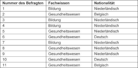 Die Befragten waren Experten aus dem Gesundheits- und Bildungswesen. Sie qualifizierten sich als „Gesundheitsexperten“, wenn sie mehr als ein Jahr Erfahrung in der Bereitstellung und/oder Organisation grenzüberschreitender Gesundheitsversorgung hatten (z. B. als Krankenschwester oder Politikberater in einem Krankenhaus in der Grenzregion) und als „Bildungsexperten“, wenn sie mehr als ein Jahr Erfahrung in der Ausbildung von Gesundheitsberufen hatten. Unter Berücksichtigung dieser Einschlusskriterien rekrutierten wir Experten aus unserem eigenen Netzwerk, wobei wir uns um eine Vielfalt an beruflichen und nationalen Hintergründen bemühten (Convenience- und Purpose Sampling-Methoden). Wir informierten die Experten über das Studienverfahren und luden sie per E-Mail zur Teilnahme ein. Wir sprachen 12 Personen an, von denen 11 in die Studie aufgenommen wurden. Die Merkmale der Befragten sind im Abschnitt Ergebnisse aufgeführt.