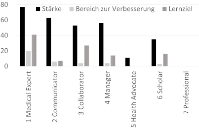 Wir überprüften, ob jedes dokumentierte Lernziel sich einem oder mehreren Items des MSF-Fragebogens zuordnen lässt. Ziele, die mit mehr als einem Item verbunden waren (z. B. „Erwerb von Wissen“) oder Ziele, die keinen Bezug zum MSF-Fragebogen zu haben schienen, wurden qualitativ analysiert und separat gezählt. Anschliessend haben wir alle Lernziele den CanMEDS-Rollen zugeordnet (siehe Tabelle 2 [Tab. 2]).