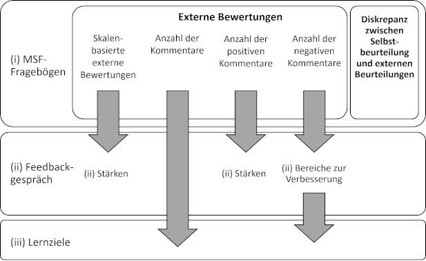 Der MSF-Prozess in dieser Studie umfasste bis zu 15 externe Bewertende aus vordefinierten Gruppen von Mitarbeitenden, die zweimal jährlich Feedbacks gaben. Die Bewertenden füllten den MSF-Fragebogen online aus, ihr Feedback wurde später anonymisiert und zusammengefasst verwendet. Während des Feedbackgesprächs teilte die Supervisionsperson den Mittelwert der skalenbasierten Bewertungen mit und fasste narrative Kommentare zusammen, die ihr wichtig erschienen. Die Supervisionspersonen und die Weiterzubildenden entschieden jeweils gemeinsam, welche Items des MSF-Fragebogens besprochen werden sollten, legten die Themen für das Feedbackgespräch fest und bestimmten die Anzahl und den Inhalt der Lernziele. Sie dokumentierten die MSF-Bewertungen, Stärken oder Bereiche der Verbesserung, sowie die Lernziele in einem strukturierten Formular.
