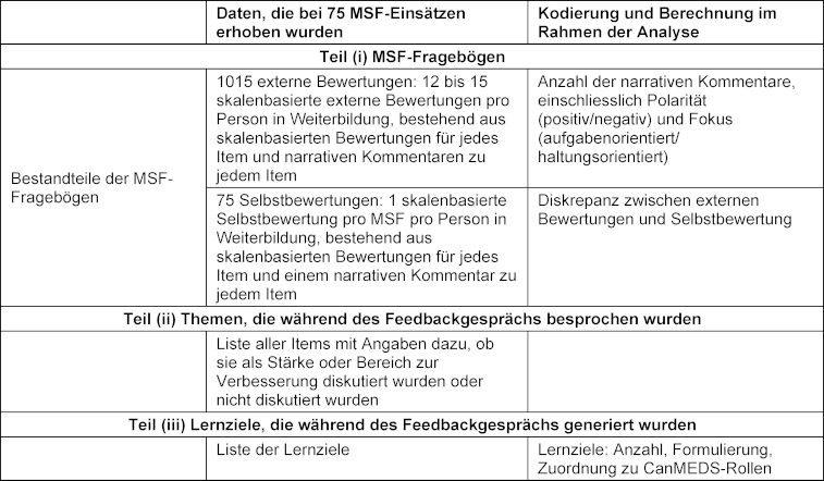 Die Studie umfasste 75 MSF-Datensätze, die pro Person in Weiterbildung aus 12-15 externen Bewertungen und einer Selbstbewertung bestanden. Die Daten umfassten insgesamt 1015 externe Bewertungen und 75 Selbstbewertungen. Da in zehn Datensätzen die Lernziele fehlten, konnten nur 65 MSF-Datensätze analysiert werden. Detailliertere Informationen und eine Übersicht über die drei Teile des Feedbackgesprächs sind in Tabelle 1 [Tab. 1] dargestellt.