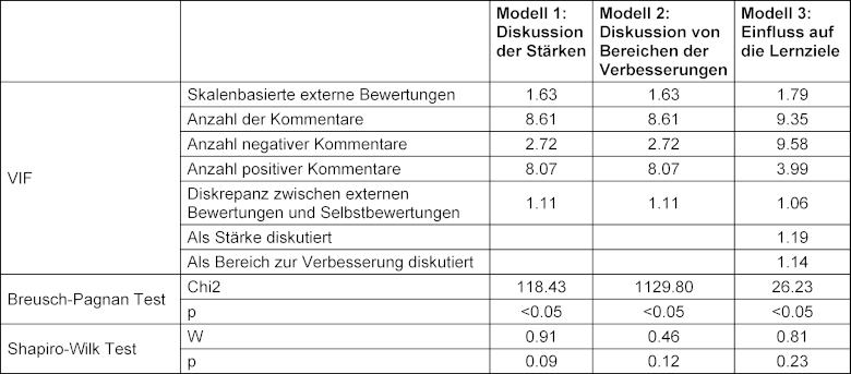 Wir verwendeten multiple lineare Regressionen, um den Einfluss der skalenbasierten externen Bewertungen, der Anzahl der Kommentare, der Anzahl der positiven Kommentare, der Anzahl der negativen Kommentare und der Diskrepanz zwischen externen Bewertungen und Selbstbewertungen zu ermitteln. Um zu überprüfen, ob die Annahmen für multiple lineare Regressionen erfüllt waren, verwendeten wir den Breusch-Pagan-Test zur Analyse der Homoskedastizität, den VIF-Wert zur Analyse der Multikollinearität und den Shapiro-Wilk-Test zur Prüfung der Normalverteilung der Residuen. Da alle drei Modelle einen signifikanten Breusch-Pagan-Test auf Heteroskedazität zeigten, haben wir heteroskedazitätskonsistente Standardfehler verwendet. In allen drei Modellen lagen die VIF-Werte unter 10, was auf keine Multikollinearität hindeutet. Nach dem Shapiro-Wilk-Test waren die Residuen normalverteilt. Die Ergebnisse der statistischen Analyse sind in Tabelle 2 [Tab. 2] zu finden.
