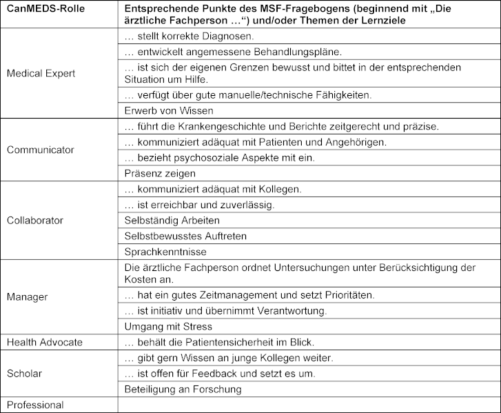 Tabelle 3: Zuordnung der Items des MSF-Fragebogens und der Lernziele zu den CanMEDS-Rollen. Die CanMEDS-Rollen wurden bewusst nicht ins Deutsche übersetzt
