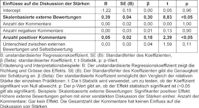 Eine höhere Anzahl positiver Kommentare pro Item (Β=0,05, β=0,18, p<0,05) erhöhte die Wahrscheinlichkeit, dass das Thema als Stärke diskutiert wurde, signifikant.