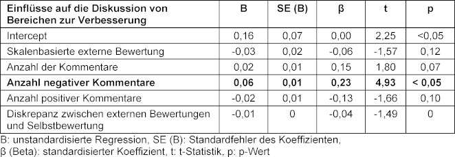 Eine höhere Anzahl negativer Kommentare pro Item (Β=0,06. β=0,23. p<0,05) erhöhte die Wahrscheinlichkeit, dass das Thema als verbesserungswürdig diskutiert wurde, signifikant. Skalenbasierte externe Bewertungen (Β=-0,03. β=-0,06. p=0,12), die Gesamtzahl der Kommentare (Β=0,02. β=0,15. p=0,07), die Anzahl der positiven Kommentare (Β=-0,02. β=-0,13. p=0,10) und die Diskrepanz zwischen externen Bewertungen und Selbstbewertung (Β=-0,01. β=-0,04. p=0,14) hatten keinen signifikanten Einfluss darauf, ob ein Thema als Bereich der Verbesserung diskutiert wurde (siehe Tabelle 5 [Tab. 5]).