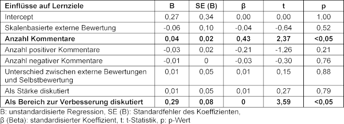 Skalenbasierte externe Bewertungen (Β=-0,06, β=-0,04, p=0,52), die Anzahl der positiven Kommentare (Β=-0,03. β=-0,21. p=0,21), die Anzahl der negativen Kommentare (Β=-0,01. β=-0,03. p=0,76), die Diskrepanz zwischen externen Bewertungen und Selbstbewertung (Β=0,01. β=0,01. p=0,88) und die Erwähnung eines Themas als Stärke hatten keinen signifikanten Einfluss auf dessen Übertragung in ein Lernziel (Β=0,01. β=0,01. p=0,79) (siehe Tabelle 6 [Tab. 6]).