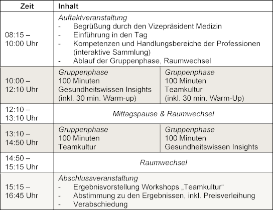 Der Interprofessionelle Tag besteht in seinem neuen Konzept aus einer Auftaktveranstaltung, den Workshopformaten „100 Minuten Teamkultur“ (TK-Workshop) und „100 Minuten Gesundheitswissen Insights“ (GWI-Workshop) sowie einer Abschlussveranstaltung. Der Ablauf des Interprofessionellen Tages 2024 kann Tabelle 1 [Tab. 1] entnommen werden.