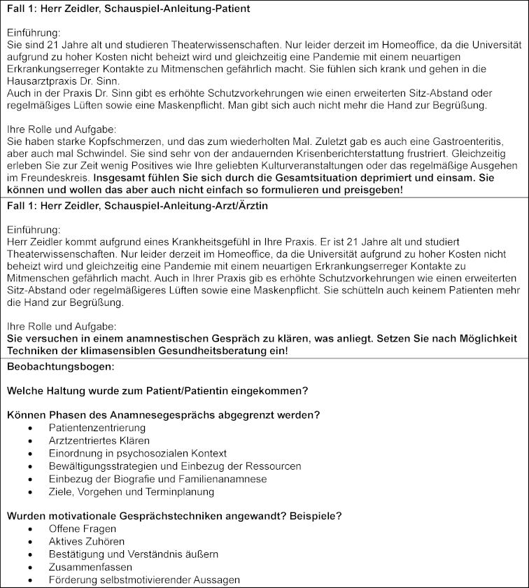 In der Kleingruppe Klimasensible Beratung in der Praxis (Lehrstuhl für Allgemeinmedizin, zwei UE) werden die Sozialformen Plenum frontal und interaktiv genutzt. In Gesprächssimulationen und Diskussionsrunden wird interaktiv gearbeitet. Das bislang Gelernte wird reflektiert, Vorerfahrungen der Studierenden werden besprochen und es werden Fallstricke der KSGB in der hausärztlichen Sprechstunde beleuchtet. Die Lehrenden können Tipps und Erfahrungen aus dem eigenen hausärztlichen Alltag weitergeben. Zudem wird in Rollenspielen Kommunikationskompetenz mit Fokus auf motivierender Gesprächsführung trainiert (Beispiel einer Fallvignette: siehe Abbildung 3 [Abb. 3]). Hierbei wird auch auf die für die KSGB wichtige Fähigkeit, Gespräche zu strukturieren, abgezielt. Nach einer Reflexion der Lehreinheit wird die Gruppenarbeitsphase mit Anweisungen zur Erarbeitung des Produkts abgeschlossen. Die wichtigsten Lernziele dieser Einheit umfassen die Fähigkeit, das Konzept Planetary Health beschreiben und Co-Benefits formulieren zu können. Zudem ist es auch Ziel, die Fähigkeit motivierender Gesprächsführung zu verbessern.