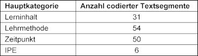 Es wurden vier deduktive Hauptkategorien auf Basis der Freitextantworten codiert. Dabei beziehen sich drei Hauptkategorien auf drei Merkmale zur Entwicklung einer Lehrveranstaltung. Diese sind: Lerninhalt, Lehrmethode, Zeitpunkt [34]. Insgesamt konnten 141 Textsegmente aus den Freitextantworten den Hauptkategorien zugewiesen werden. Tabelle 3 [Tab. 3] zeigt alle für das Auswertungsergebnis relevanten Hauptkategorien sowie die Anzahl der codierten Textsegmente je Hauptkategorie.