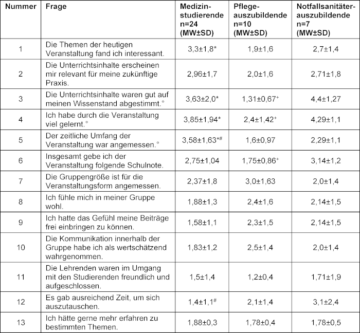 Den MS war die Lehreinheit zu lang (siehe Tabelle 3 [Tab. 3], Frage 5) und sie empfanden die Zeit für Austausch zwischen den Berufsgruppen als ausreichend (siehe Tabelle 3 [Tab. 3], Frage 12), wohingegen die NotS die Zeit für Austausch als ungenügend einstuften. Aus den vorliegenden Daten kann man schlussfolgern, dass sich die NotS bei hoher Vorbildung zum Thema besonders auf den IP informellen Austausch mit den anderen eingestellt hatten. Eine vorherige Erwartungsabfrage bei den verschiedener Berufsgruppen könnte zur Berücksichtigung der Bedürfnisse aller Beteiligten hilfreich sein.