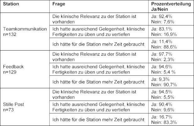 In der quantitativen Analyse zeigte sich für alle 3 Stationen ein einheitliches Bild (siehe Tabelle 4 [Tab. 4]). Alle Stationen wurden als klinisch relevant eingestuft und die TN hatten ausreichend Gelegenheit zum Üben.