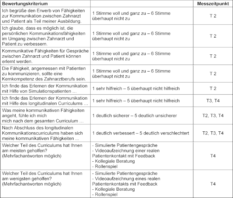 Das Curriculum wurde allgemein anhand eines selbst erstellten Fragebogens unter Verwendung einer 5- oder 6-Punkte-Likert-Skala evaluiert. Die Studierenden bewerteten verschiedene Aspekte des Lehrplans danach, wie hilfreich sie waren oder inwieweit ein Aspekt zur Verbesserung ihrer eigenen Kommunikationsfähigkeiten zu T2, T3 und T4 beitrug. Zu diesem Zweck wurden sowohl die SP-Begegnungen als auch die praktischen Kurse bewertet (siehe Tabelle 1 [Tab. 1]). Die 5-Punkte-Likert-Skalen wurden verwendet, wenn die Studierenden gebeten wurden, ihren eigenen Lernfortschritt zu bewerten, wobei 3 als „weder noch”-Option angegeben wurde. Eine 6-Punkte-Likert-Skala wurde für die Bewertung der Bedeutung der Kommunikation in der Zahnmedizin verwendet. Die 6-Punkte-Skala sollte eine Tendenz zur Mitte vermeiden.