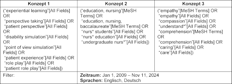 Die zur Entwicklung der PubMed-Suchstrategie verwendeten Konzepte und Suchbegriffe sind in Tabelle 1 [Tab. 1] dargestellt.